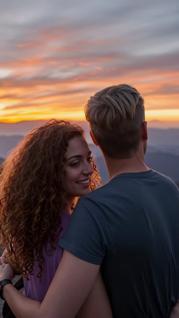AI Generated Video. Video showing couple hugging on mountain ridge at sunset with glowing horizon and layered mountain silhouettes. Woman wearing purple top and smartwatch, leaning into partner while smiling and creating intimate romantic moment. Warm golden and purple sky tones adding cinematic atmosphere and soft backlight on faces. Clip working well for social media stories and vertical ad formats, dating app promos, travel and tourism campaigns, lifestyle and wellness channels, romantic blog headers, and wedding inspiration reels. Suggested usage: overlay text for destination promotion, add soft acoustic music for romantic mood, apply slow motion or subtle zoom for emphasis, crop for Instagram Reels or TikTok, use as hero background for travel website or relationship-focused content.