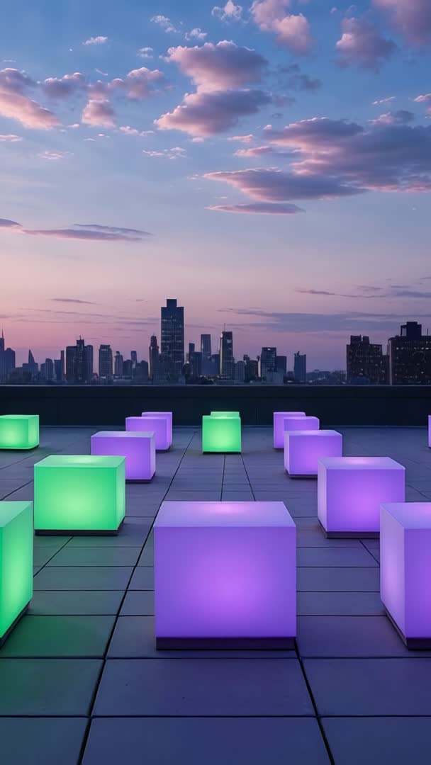AI Generated Image. Vertical video showing rooftop terrace with glowing LED cubes in purple and green, city skyline silhouette at twilight. Scene featuring modern geometric lighting installation, smooth tiled floor, pastel sky with scattered clouds, distant skyscraper silhouettes. Visual tone creating futuristic, ambient, serene atmosphere for tech, design, nightlife, or wellness projects. Use cases including social media vertical reels, app and website hero backgrounds, event promo loops, urban architecture showcases, product launch backdrops. Editing tips: keeping slow pan or subtle parallax for immersive feel, matching music with soft electronic ambient tones, adjusting color grade to enhance purple and green contrast.
