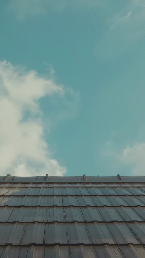 AI Generated Image. Vertical video capturing metal roof edge and wide blue sky with drifting clouds. Camera holding steady upward angle showing rows of metal tiles and gutter line. Composition providing large negative space for text and graphic overlays. Footage delivering calm, atmospheric mood suitable for slow cinematic pacing or looped background. Use cases include social media reel backgrounds, opening shot for architecture or construction videos, roof inspection B-roll, weather intro, real estate marketing, roofing contractor promos, and ambient app backgrounds. Editing suggestions: applying slow-motion playback for cinematic feel, using teal-cinematic or warm-natural color grading, adding subtle motion blur for smoother loop. Design tips: placing logo or headline in upper third negative space, using lower third for call-to-action or contact info. File format recommendation: vertical 9:16 optimized for mobile platforms and short-form video distribution.