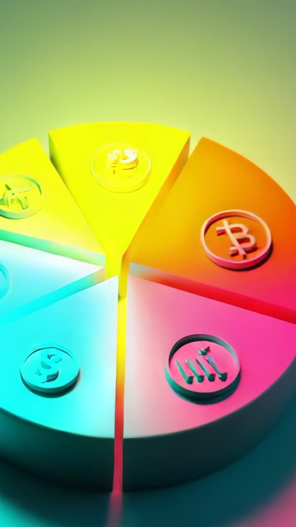 AI Generated Video. Vertical video showing rotating 3D pie chart with colorful segments, each segment embossed with crypto icons such as Bitcoin and Ethereum. Studio-style color grading and directional lighting creating modern, futuristic mood. Smooth rotation and close-up framing delivering strong visual impact on mobile screens. Suitable for fintech brands, crypto exchanges, blockchain startups, investor presentations, app intros, social media reels, mobile ads. Ideal for hero backgrounds, motion graphic overlays, explainer sequences, landing pages, pitch decks. File working well for vertical platforms like Instagram Reels, TikTok, Snapchat, offering easy color grading and icon customization for brand-specific messaging.