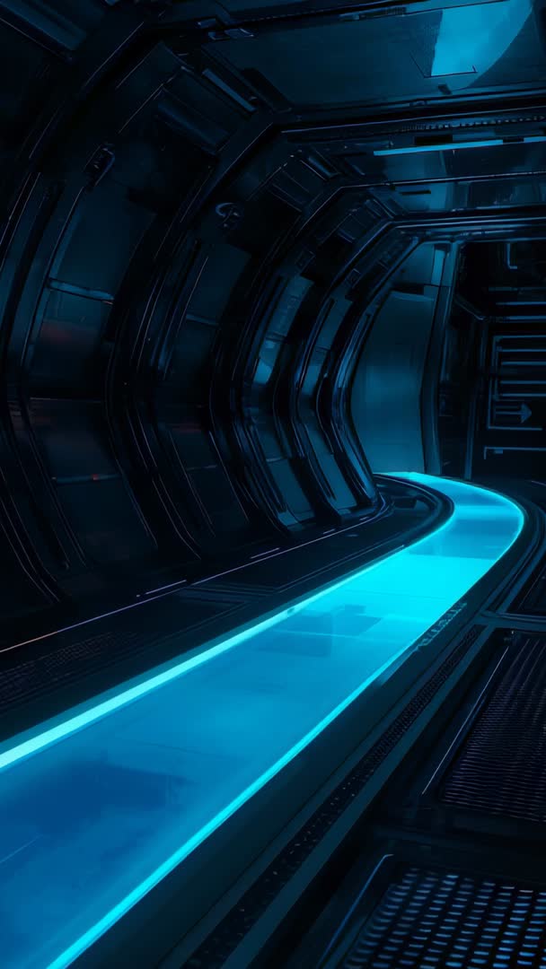 AI Generated Video. Showing camera moving along glowing cyan walkway inside futuristic spaceship corridor, revealing curved metal panels and deep perspective. Conveying high-tech, mysterious mood with neon blue lighting and sleek industrial details. Working well as vertical video background for tech promos, mobile ads, title reveals, app intros, VR environment previews, and game trailer sequences. Useful for concept art, motion graphics, broadcast bumpers, and UI demo presentations that require futuristic atmosphere. Suitable for 9:16 vertical format, loop-friendly, adaptable for color grading and visual effects overlays.