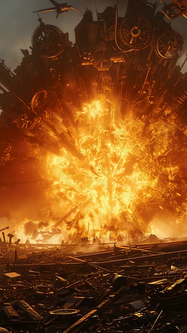 - Vertical scrap yard explosion igniting industrial wreckage and scattering fiery embers
