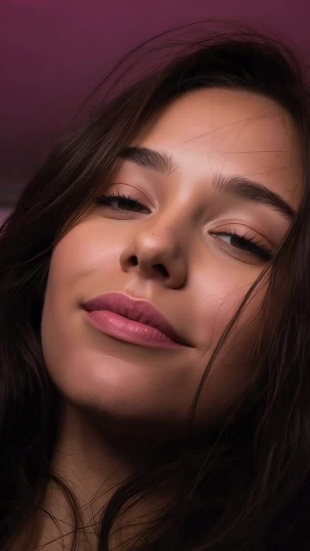 AI Generated Video. Closeup vertical clip showing woman starting recording and adjusting head while holding smartphone in pastel pink room. Soft light highlighting natural skin texture and subtle makeup, creating intimate and candid mood. Serving social media content needs including Instagram Reels, TikTok, YouTube Shorts, influencer vlogs, makeup tutorials, beauty campaigns, app promos, and mobile advertising. Recommending edit choices such as slow push-in, warm color grade, gentle ambient music, and text overlays or subtitles for messaging and call-to-action. Fitting for themes about self-care, beauty routine, confidence, personal storytelling, and mobile filming tips. Suggesting use for commercial beauty ads, lifestyle branding, tutorial thumbnails, hero banners, and influencer content with appropriate talent release.