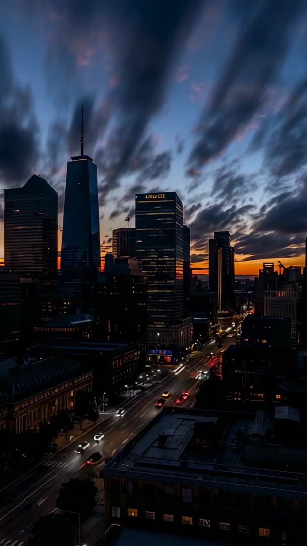 AI Generated Image. Vertical 9:16 video showcasing downtown skyline at dusk with skyscraper spire casting long shadow over rooftops, car headlights creating light trails along busy avenue. Blue and orange sunset tones providing dramatic contrast, clouds streaking across sky and glossy glass towers reflecting last light while street lights beginning to glow. Suitable for fueling social media vertical ads, enhancing city travel promos, complementing urban lifestyle videos, opening nightly news segments, providing b-roll for real estate or architecture features. Technical details: vertical 9:16 aspect ratio, slow-shutter look producing light trails, low-light night palette, compatible with 4K and HD projects.