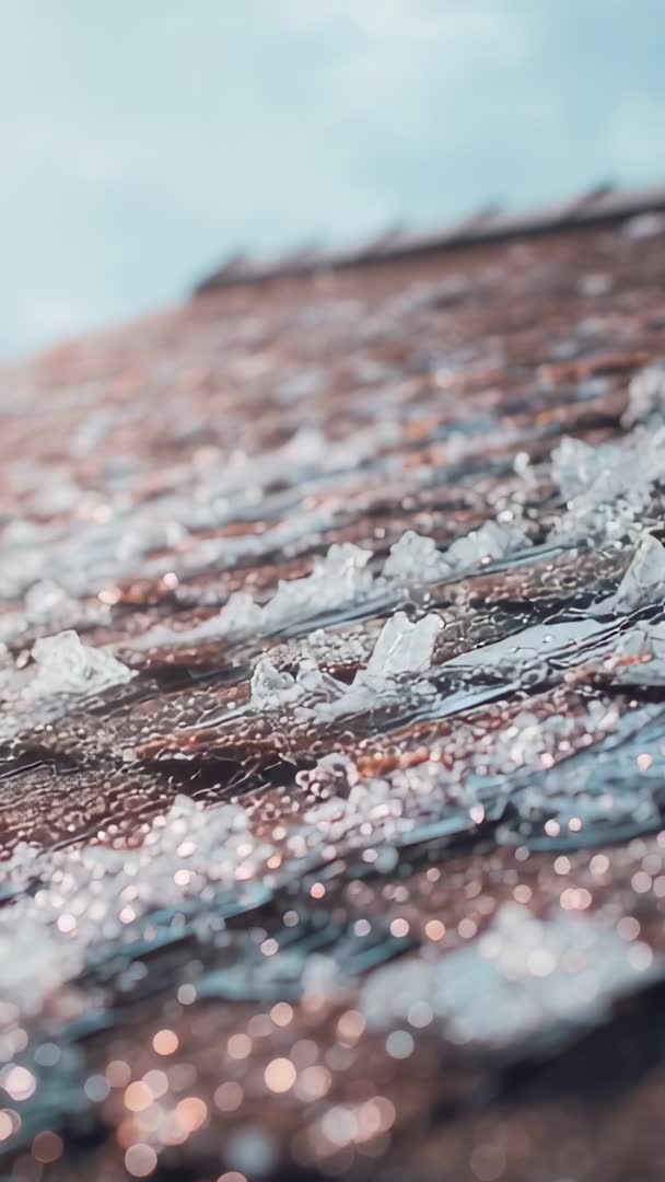 AI Generated Image. Vertical footage showing sleet pelting asphalt shingles, sending splashes, beads, and rivulets while ice melting under cloudy sky. Close-up shallow depth of field creating soft bokeh highlights and emphasizing wet texture of shingles and glistening droplets. Working well for illustrating winter weather, roof maintenance, storm coverage, insurance claim visuals, and home improvement content. Serving as vertical background for social media stories, mobile ads, broadcast lower thirds, website hero loops, and B-roll in documentary or commercial edits. Color palette offering cool blue-gray highlights and warm copper tones, suiting mood-driven cinematography and editorial layouts. Recommended usage: overlaying text or graphics on out-of-focus sky area, looping for ambient background, cutting into weather report or roofing tutorial, and supporting safety or insurance messaging.