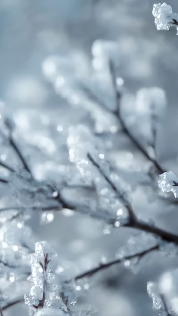 AI Generated Video. Gliding camera revealing closeup of frosted twig cluster with sparkling ice droplets, capturing delicate crystalline textures and soft bokeh. Showing cool blue tones and shimmering highlights for cinematic winter mood. Emphasizing shallow depth of field and abstract branch patterns for visual interest. Perfect for vertical social media stories, mobile wallpaper, seasonal advertising, holiday greeting reels, nature documentary b-roll, and calming background loops. Supporting color grading and text or logo overlays for promos and title sequences. Offering loop-friendly motion and high-resolution vertical composition for mobile-first projects and website hero sections.