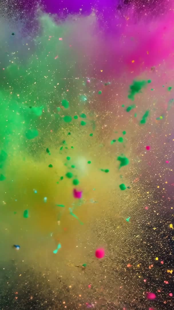 AI Generated Image. Vertical video capturing color powder cloud bursting in dark studio, neon green, magenta and gold particles expanding in slow motion. High-speed capture revealing fine dust, paint flecks and glitter scattering across frame, creating dramatic depth and texture. Perfect for vertical social media reels, story ads, mobile backgrounds and motion graphics overlays. Use for festival marketing, Holi celebration promos, music video transitions, cosmetic and beauty campaign visuals, abstract art installations and dynamic website hero banners. Clip looping well for background movement and scene transitions; color grade flexible for brand matching. Shot details: high-speed camera, backlit powder, dark backdrop, shallow depth of field, vibrant neon palette. Delivery notes: vertical orientation ideal for mobile-first platforms, supporting slow-motion playback and 4K export.