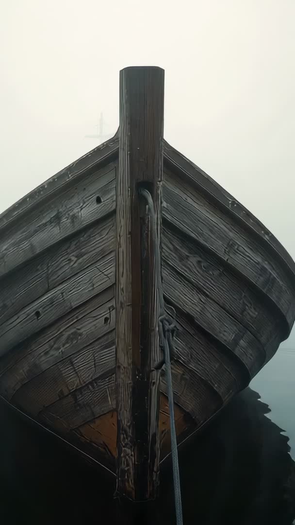 AI Generated Image. Vertical clip showing slow rising camera, revealing bow of weathered wooden boat being moored to dock amid heavy fog. Close-up capturing textured timber planks, mooring line and knot details with reflective calm water below. Background fading into soft mist, creating moody cinematic atmosphere. Working well as opening shot for maritime documentary, travel film, heritage feature or atmospheric commercial. Serving as vertical background for social media ads, mobile hero banners, title sequences or storytelling reels. Being suitable for branding projects, editorial features, website headers, gallery prints or stock video libraries. Post-production suggestions including applying muted color grade, adding subtle ambient water sounds and low-frequency foghorn tones, and using slow crossfade transitions to enhance mood. Licensing options covering commercial and editorial use for maritime, travel and lifestyle campaigns.