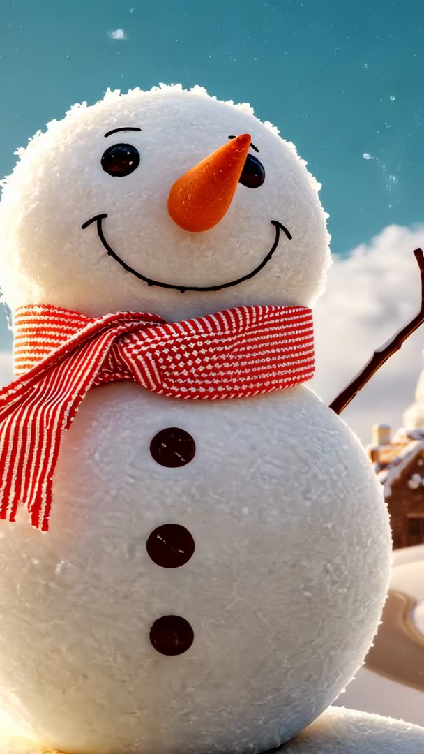 AI Generated Image. Vertical video featuring close-up snowman smiling with carrot nose and red scarf, snowflakes drifting against clear blue sky while camera zooming in. Warm golden sunlight casting soft glow on textured snow body, creating cozy festive mood. Vertical format optimized for mobile social platforms and video ads, fitting Instagram Reels, TikTok, Snapchat, and mobile web banners. Creative uses include holiday social media reels, seasonal greeting intros, winter product promos, store window loop, family greeting cards, festive newsletter headers. Visual tone conveying playful nostalgia, friendly personality, and family-friendly charm, supporting themes of celebration, togetherness, and winter wonder. Colorful composition and shallow depth creating strong thumbnail impact for campaign titles and short-form video transitions.