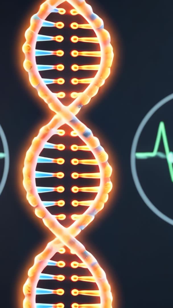 - Vertical spinning glowing DNA double helix pulsing base pairs syncing with heart monitor