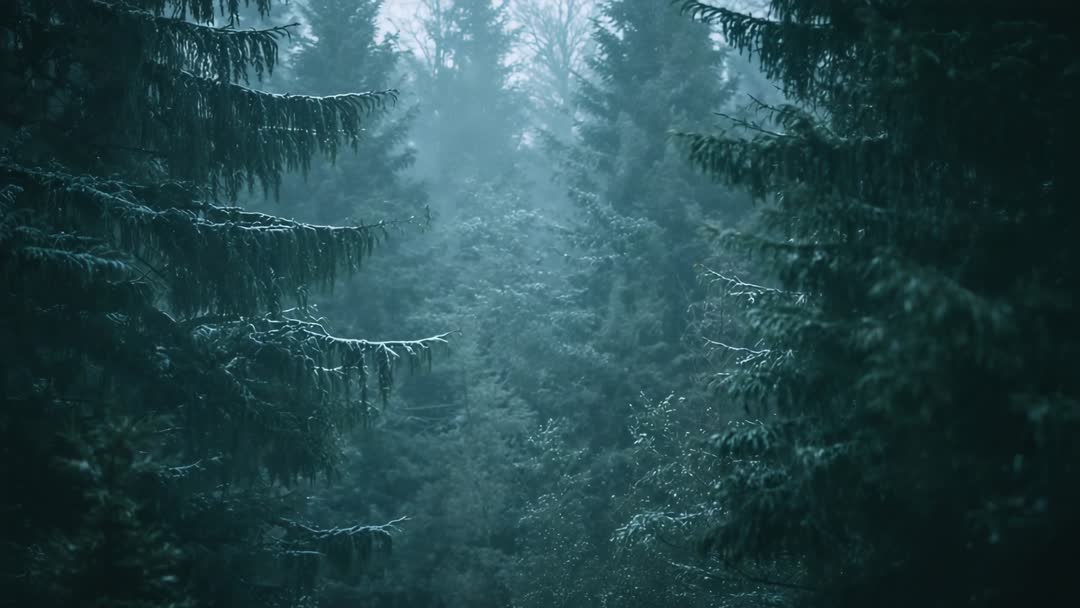 AI Generated Video. Camera capturing vertical slice of dense spruce canopy, mist rising through branches while light sleet beginning to fall, creating moody, cinematic atmosphere. Close framing and soft blue-green color palette emphasizing cold, wet mood and depth. Footage suitable for nature documentaries, film openers, meditation and relaxation backgrounds, seasonal marketing, and environmental campaigns. Use as hero background for websites, title card motion backplates, social video posts, or layered element in editing timelines. Recommend color grading with cool tones, adding subtle wind and sleet sound design, and using slow motion or slight time remap for enhanced cinematic feel. Vertical orientation optimized for mobile and social vertical formats.