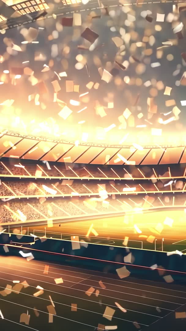 - Vertical stadium celebration video showing golden confetti shower and illuminated running track