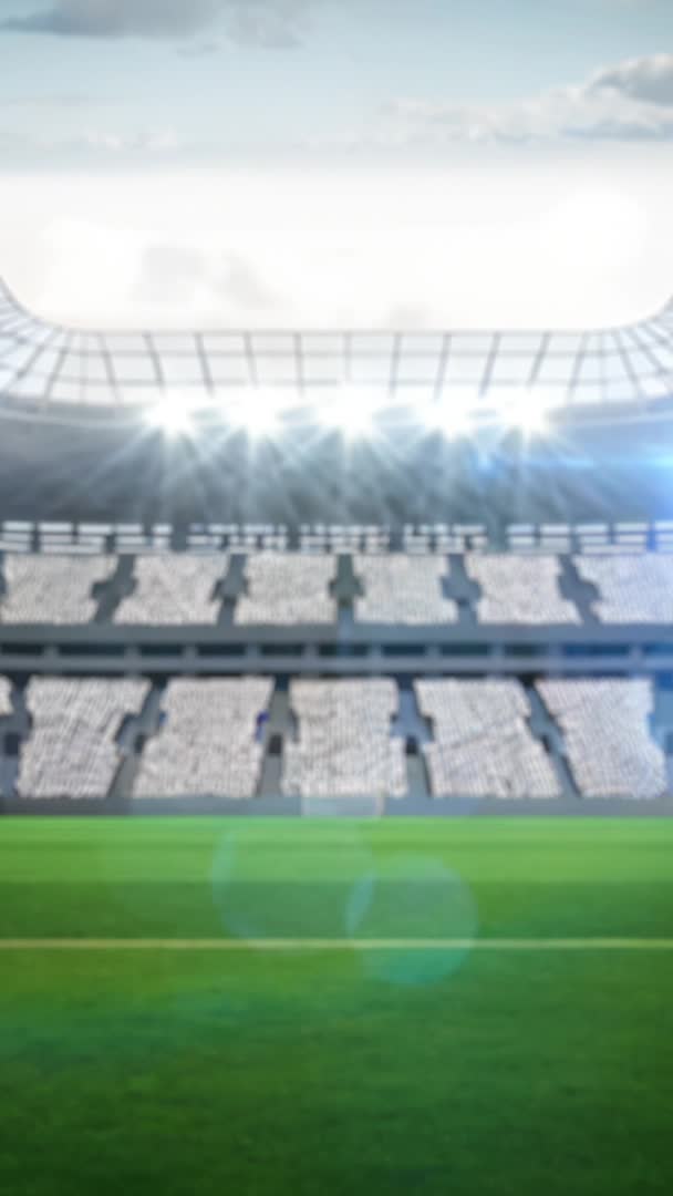 AI Generated Image. Vertical opening shot showing modern outdoor stadium with lush green turf and bright floodlights illuminating stands. Empty seats forming grid patterns across tiers. Roof structure framing cloudy sky while stadium lights creating dramatic lens flare and cinematic atmosphere. Camera height suggesting first-person entrance onto pitch. Perfect for sports broadcast intros, match highlight reels, live event promos, social media vertical ads, mobile app backgrounds, scoreboard graphics, stadium promo videos. Blending with motion graphics and text overlays for countdowns, team reveals, ticket sale announcements. Color grading for day-to-night transition and adding slow zoom for dramatic opener.