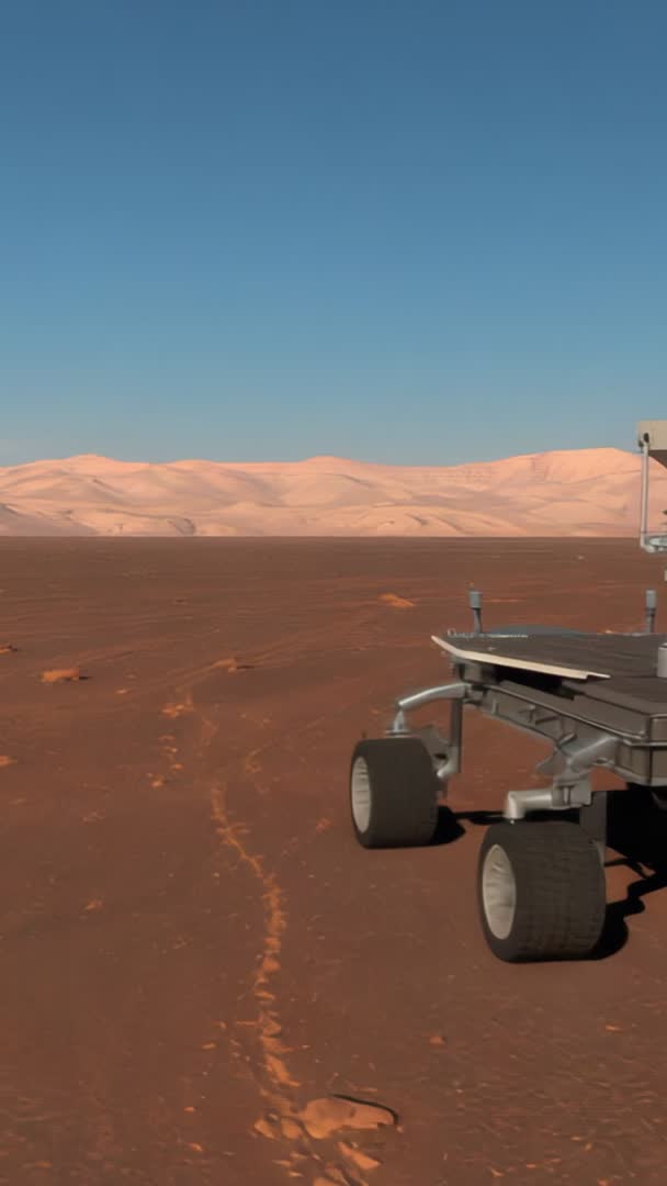 AI Generated Image. Vertical startup pan showing six-wheel rover traversing red Martian plain with visible mast turret and wide sky above creating generous copy space at top. Foreground wheels and tracks providing sense of scale and movement while distant pale dunes forming layered horizon. Color palette featuring rusty red ground and soft pastel dunes under clear blue sky, evoking isolation, curiosity, and technological progress. Usage ideas: Serving space mission promos, educational clips about planetary science, technology company intros, social media reels, museum exhibits, documentary sequences, app splash screens. Allowing overlaying text and logos in top copy space. Pairing with voiceover about robotics, autonomy, Mars exploration. Cropping for vertical mobile-first platforms or extracting stills for editorial use. Technical notes: Startup pan delivering smooth camera movement revealing rover hardware and terrain details, suitable for slow motion or time-lapse treatments. Providing cinematic atmosphere for storytelling, scientific outreach, product demos, or promotional campaigns.