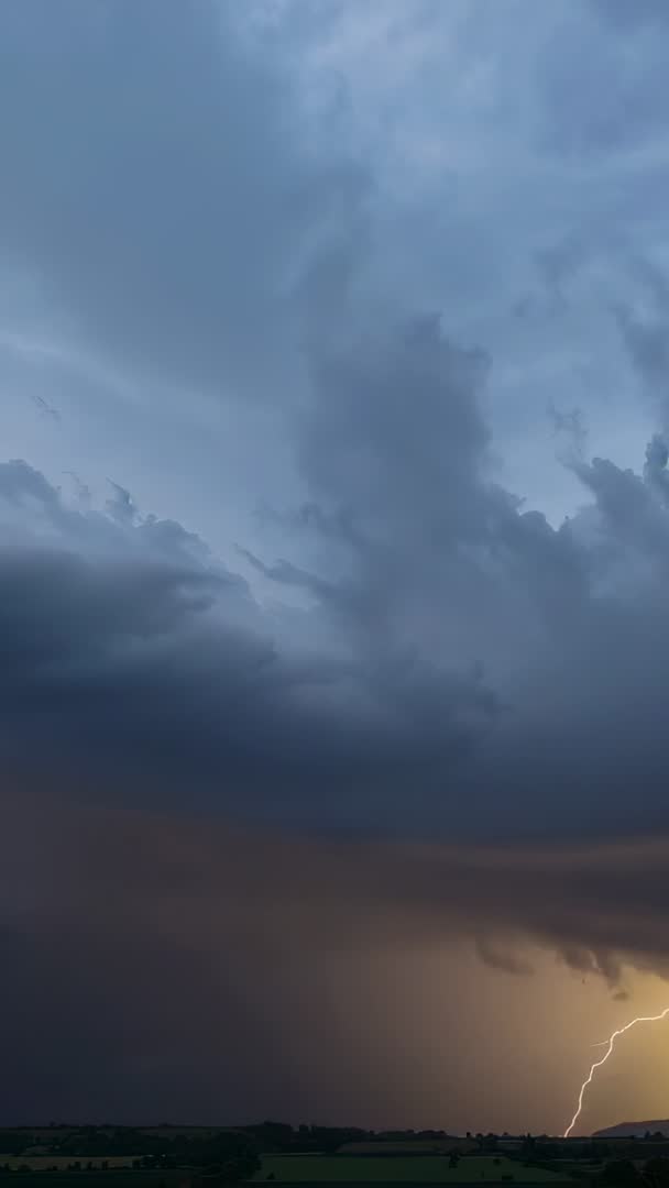 - Vertical storm footage showing cumulonimbus sending jagged lightning over farmland at dusk