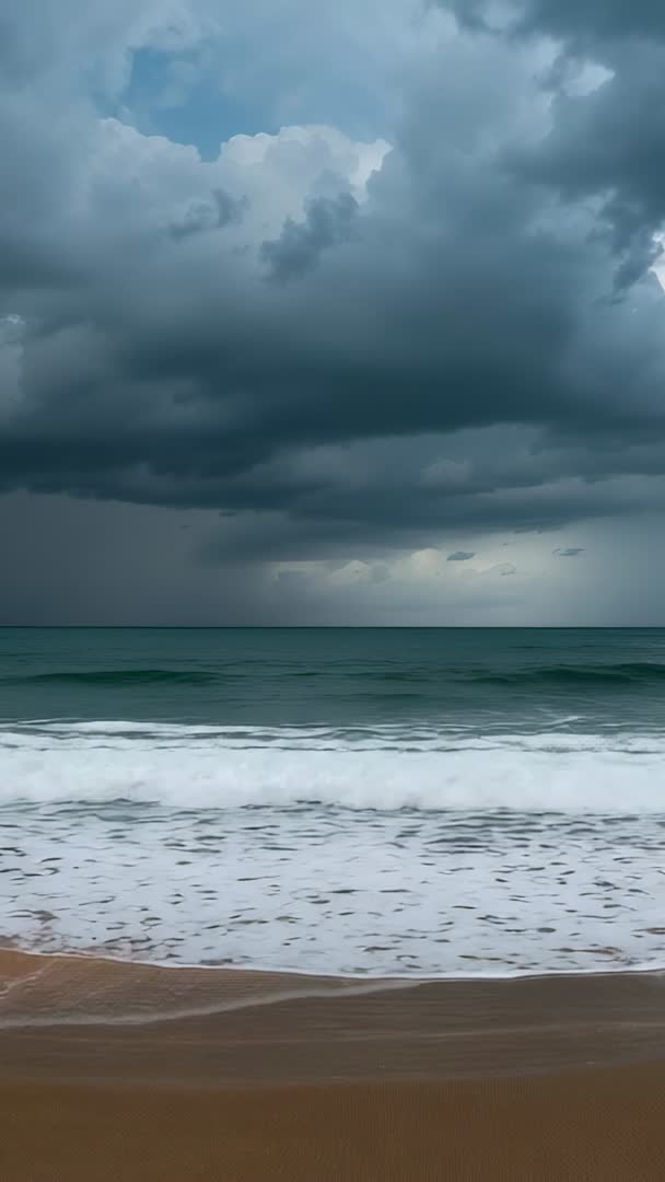 AI Generated Image. Capturing dark storm clouds rolling across ocean horizon, heavy rain curtain falling, and waves crashing onto sandy shore with foamy surf. Creating moody, cinematic atmosphere ideal for weather reports, storm warnings, and nature documentaries. Working well as vertical background for social media reels, mobile wallpapers, and website hero loops. Allowing editors to add text overlays, slow motion, color grading, and ambient sound design for dramatic effect. Suitable for marketing focused on coastal resilience, climate change storytelling, emergency preparedness campaigns, and atmospheric music videos.