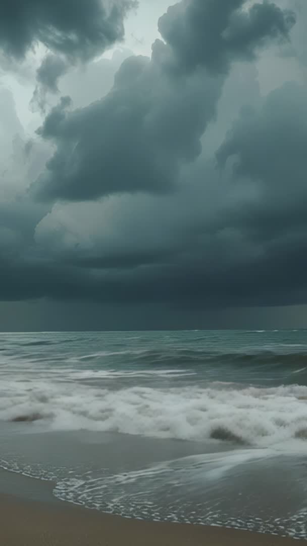 AI Generated Image. Showing dark storm clouds gathering over restless ocean while waves crashing onto sandy shoreline. Creating moody, cinematic atmosphere with teal-gray tones and dramatic cloud formations. Serving as powerful visual for weather report openers, news segments, documentary scenes, and climate change stories. Suiting vertical social media content such as Instagram reels, TikTok posts, and mobile ads, plus cinematic intros and background loops for ambient displays. Suggesting editing techniques like adding slow-motion, layered sound design with thunder and surf, subtle color grading to enhance contrast, and overlaying text or lower thirds for headlines and safety alerts. Working well for promotional material, educational content about storms, travel warnings, and creative film projects needing intense coastal drama.