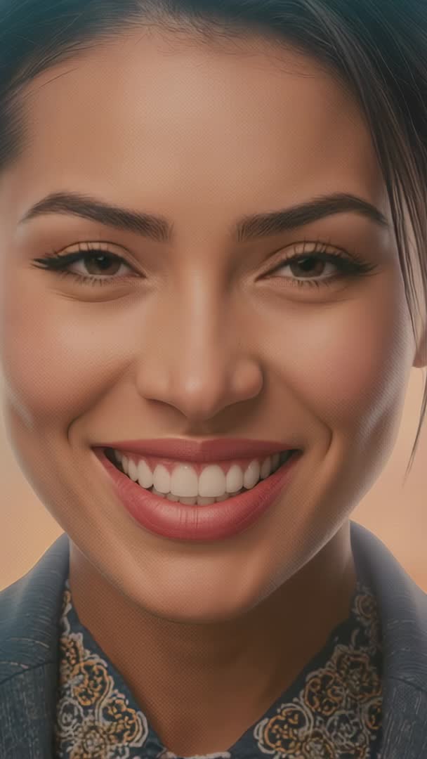 AI Generated Image. Featuring close-up vertical head-and-shoulders video of professional woman smiling and holding eye contact while wearing blazer and patterned blouse. Lighting soft and flattering, makeup natural, expression confident and approachable. Suitable for corporate about pages, LinkedIn profile videos, presenter intros, testimonial clips, training modules, customer-facing ads, personal branding reels, commercial spots. Recommend using short loop (5-8 seconds) for social media stories and reels, 15-30 second edit for website hero and promotional campaigns. Provide room for lower-third graphics and logo animation at bottom third. Color grade warm, use gentle ambient music and natural voiceover for authentic tone.