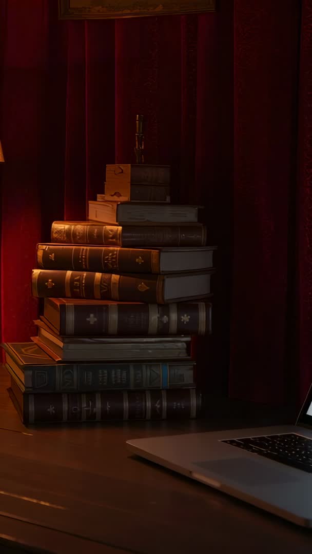 AI Generated Image. Showing stacked antique books on study desk beside laptop and candleholder, vertical footage creating warm, moody ambience and vintage scholarly mood. Velvet curtain backdrop adding deep red contrast. Soft side lighting highlighting leather spines, gilded details, wood grain. Camera holding steady, ideal for slow pan or subtle zoom. Portrait orientation matching mobile-first platforms and social reels. Working well for literary blog intros, online course promos, bookshop or library promotions, author branding, interior decor campaigns. Pairing with overlay text, title cards, or voiceover for narrative intros. Recommending warm color grade, gentle vignette, and 9:16 export. Clip functioning effectively as background for text overlays, thumbnails, trailers, or looped social shorts.