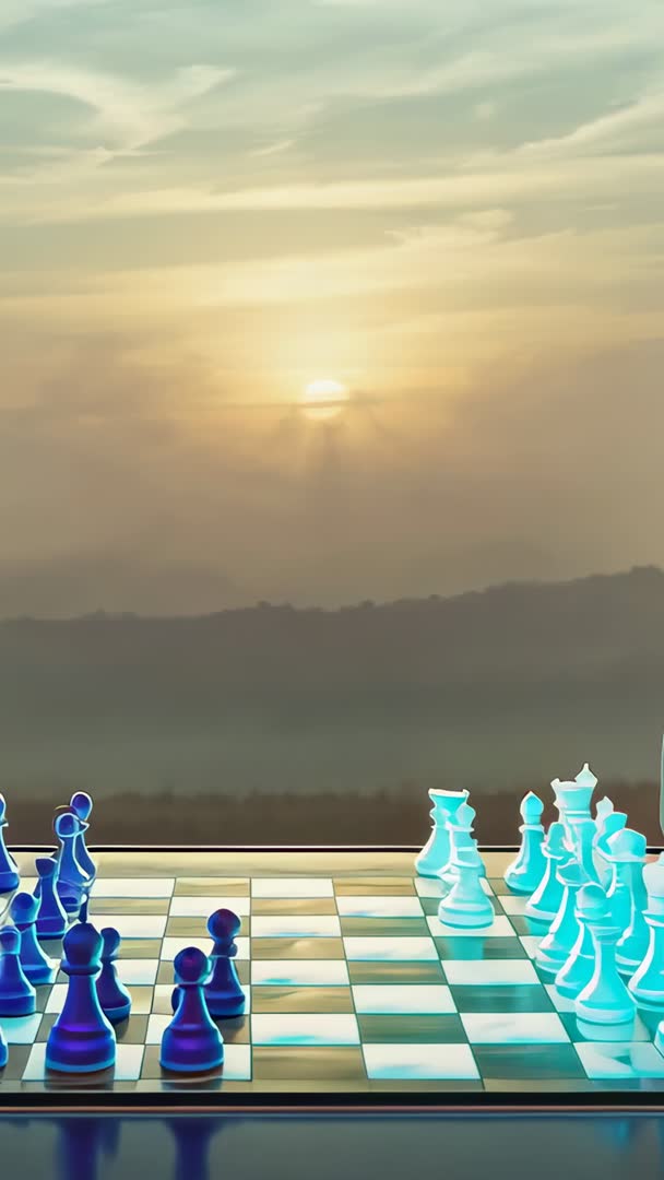 - Vertical sunrise chess move with translucent teal pieces on reflective glass board
