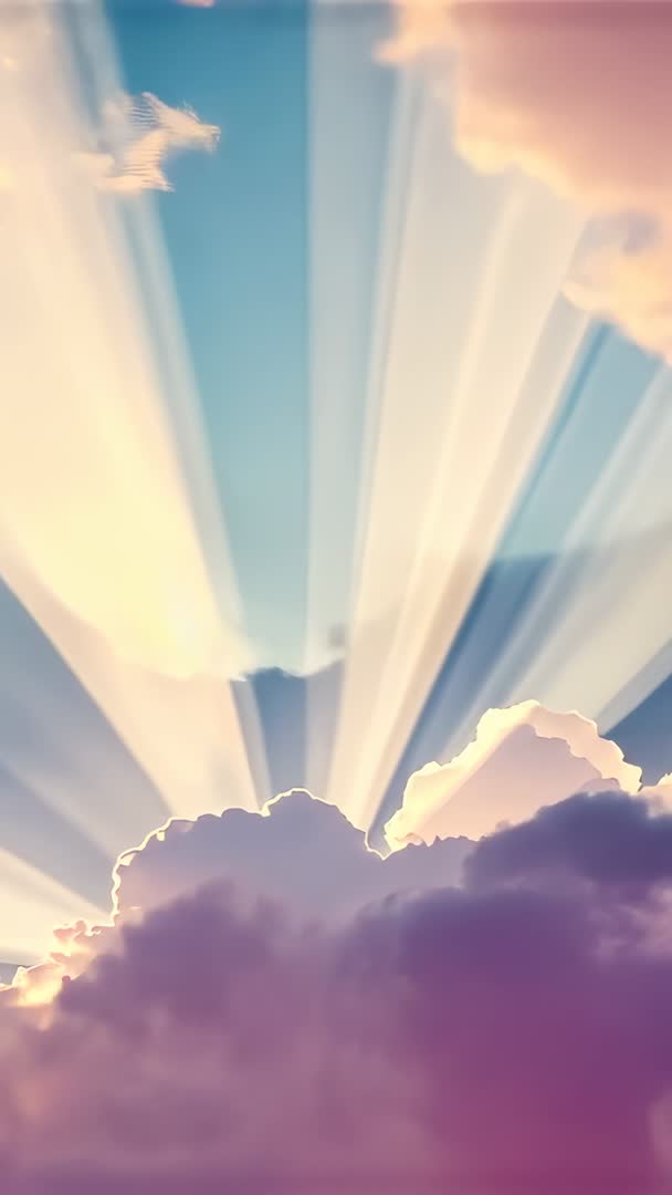 AI Generated Image. Parting cumulus clouds revealing crepuscular sunbeams at sunrise with silver linings and violet pastel tones. Vertical composition emphasizing upward rays and layered cloud depth, creating dramatic yet tranquil atmosphere. Ideal for mobile wallpapers, Instagram Reels, TikTok clips, YouTube Shorts, app intros, meditation and wellness content, spiritual or inspirational promos, travel and weather segments, broadcast openers, cinematic title sequences. Offering loopable segment and flexible color grading options: enhance violet hues for dreamy look or increase contrast for bold cinematic impact. Supplying high-resolution vertical footage for social media vertical video campaigns and background use.