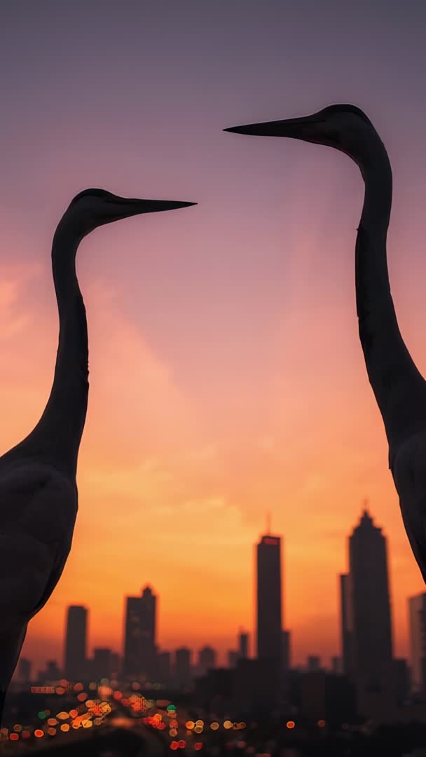 AI Generated Video. Scene showing two heron silhouettes tilting heads toward each other against warm orange-pink sunset over distant city skyline. Tall towers forming soft dark shapes while street lights turning into colorful bokeh along lower frame. Vertical composition emphasizing height and intimacy between birds, creating cinematic contrast between nature and urban life. Colors featuring gradient from deep orange to purple, offering strong negative space for overlay text or logos. Footage working well for social media stories, mobile wallpapers, branded vertical ads, travel and wildlife campaigns, conservation messaging, editorial openers. Creative suggestions: use slow vertical pan or subtle push-in to enhance drama; place headline copy in upper third where sky remains uncluttered; add ambient piano or synth pad for moody commercial spots; crop for thumbnail focusing on bird heads for hero visuals.