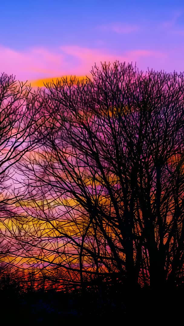 AI Generated Image. Vertical sunset video showing shifting clouds and glowing sky colors behind silhouetted bare tree and rural treeline. Clouds moving from deep blue into pink, purple and orange, creating painterly gradient while tree branches form intricate black lattice. Slow cinematic motion providing meditative, atmospheric mood. Working well for vertical social media content such as Instagram Reels, TikTok and Snapchat stories. Useful as loopable background for mobile wallpapers, music visuals and nature vignettes. Suitable as B-roll for travel, seasonal or weather projects; adding overlay text, logo or inspirational quote working well. Recommending slight color boost and soft vignette to enhance contrast between silhouette and sky. Clip trimming working well for quick intros, social ads or ambient background scenes.