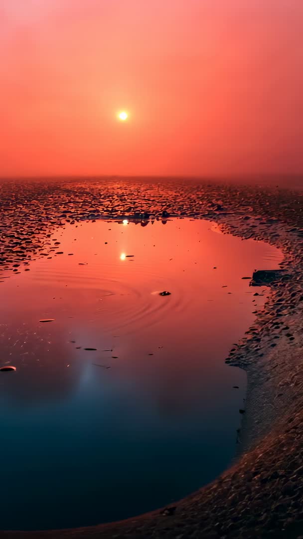 AI Generated Image. Vertical video showing sun sinking toward horizon while tidal pool reflects warm red and orange light. Foreground featuring smooth pebbles and shallow water with gentle ripples spreading from small drop. Color palette shifting from deep blue near foreground to glowing coral and crimson at distance, creating cinematic contrast. Atmosphere feeling calm and meditative, mood conveying solitude and quiet transition from day to night. Use as vertical background for social media reels and stories. Use as calming B-roll for travel promos, wellness apps, guided meditation videos. Use as hero clip for website headers and landing pages. Use as cinematic establishing shot or transition in short films and commercials. Loop for ambient screens, live event visuals, or mobile app splash screens. Shooting in vertical orientation, offering high contrast and rich color ideal for smartphone playback. Suitable for slow motion or subtle speed ramping to emphasize ripple detail and reflection movement.
