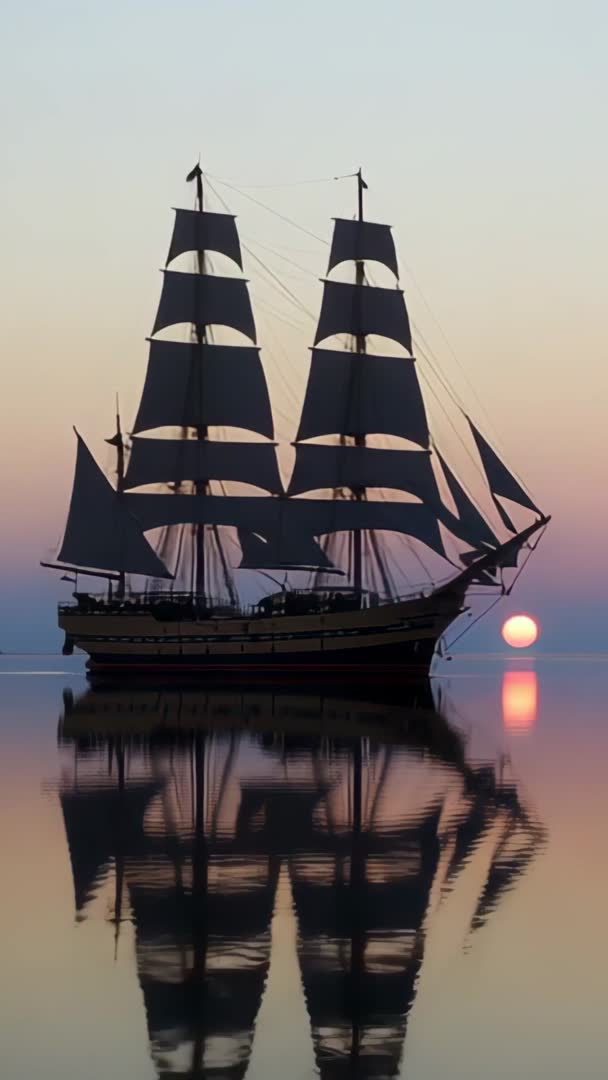 AI Generated Image. Footage showing three-masted tall ship sailing across calm sea while sun descending toward horizon, casting pastel pink and orange glow and producing near-perfect mirror reflection. Composition emphasizing dramatic silhouette and vertical format, guiding eye from mast tops down to reflected sun. Working well for travel and tourism promos, cruise line ads, maritime history documentaries, lifestyle videos, meditation and relaxation apps, social media reels and vertical video campaigns. Serving as hero background, title opener, mood-setting b-roll, cover art, cinematic transition, or stock footage library asset. Color palette working well with warm pastel branding, luxury travel content, wedding or romantic storytelling, and editorial layouts.