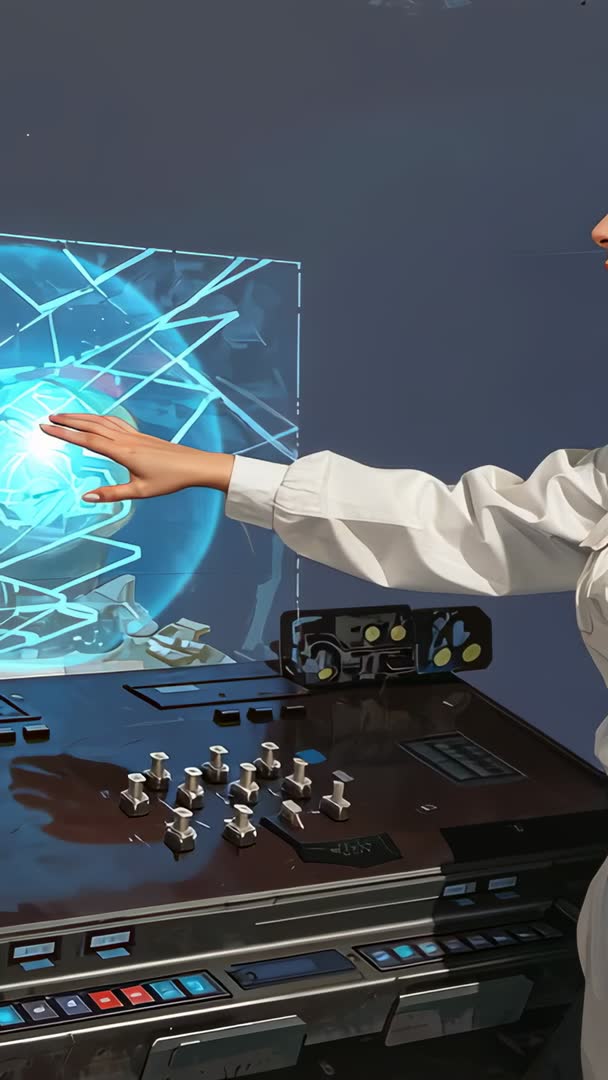 AI Generated Video. Vertical video capturing close-up of woman in white blouse touching glowing holographic interface above futuristic control console at tech expo. Hand gesture interacting with layered digital globe and grid overlay, showcasing gesture control, augmented reality interaction, and user interface demo. Useful for tech product promos, conference openers, exhibition reels, social media ads, website hero videos, and instructional clips. Cropping friendly for mobile vertical platforms, providing copy space in upper area for headlines and branding. Color palette featuring cool blues and neutral console tones, serving well as looping background, intro clip, or product demo overlay.