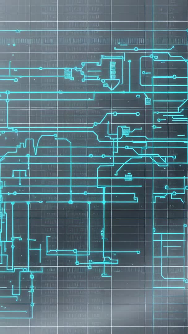 AI Generated Image. Video showing neon blue circuit schematic tracing across dark grid during system startup. Thin glowing lines pulsing and connecting modular nodes while grid overlay providing technical blueprint feel. Vertical orientation suiting mobile and social platforms and looping-ready for intro animations. Serving well for tech brand intros, cybersecurity campaigns, app demos, UI mockups, data center presentations, corporate slides, vertical ads, smartphone wallpapers, streaming overlays, VJ visuals. Allowing color grading and speed adjustments for mood shifts from calm corporate to fast-paced cyberpunk. Providing short loop segments for background motion behind text or product shots and being extendable for narrated explainer scenes.