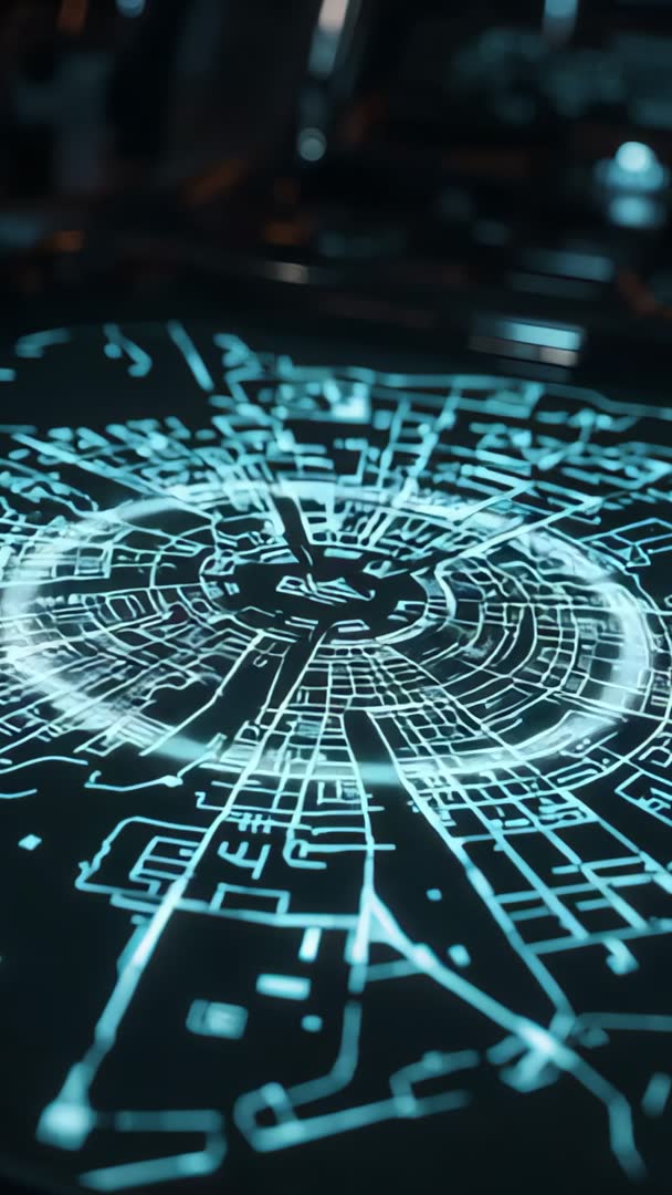 AI Generated Image. Displaying pulsing holographic ring projecting circular city-grid map across dark console, featuring neon blue lines, radial street layout, subtle depth-of-field and animated LED reflections. Camera following ring center while grid slowly rotating and pulse waves radiating outward, creating dynamic high-tech mood. Offering vertical orientation optimized for mobile and social platforms, loopable animation for seamless playback, high contrast for title overlays and lower-third graphics. Ideal for technology promo, UI demo, startup pitch, cybersecurity concept, AR/VR presentation, sci-fi title sequence, game HUD mockup, app intro, social vertical ad, broadcast graphic. Customization suggestions: replacing color palette for brand alignment, adding logo or data labels over ring, synchronizing pulse speed to soundtrack. Usage tips: using as hero visual on landing pages, layering with translucent text for product features, cutting clips for Instagram Stories or TikTok ads, integrating into presentation slides for innovation talks.
