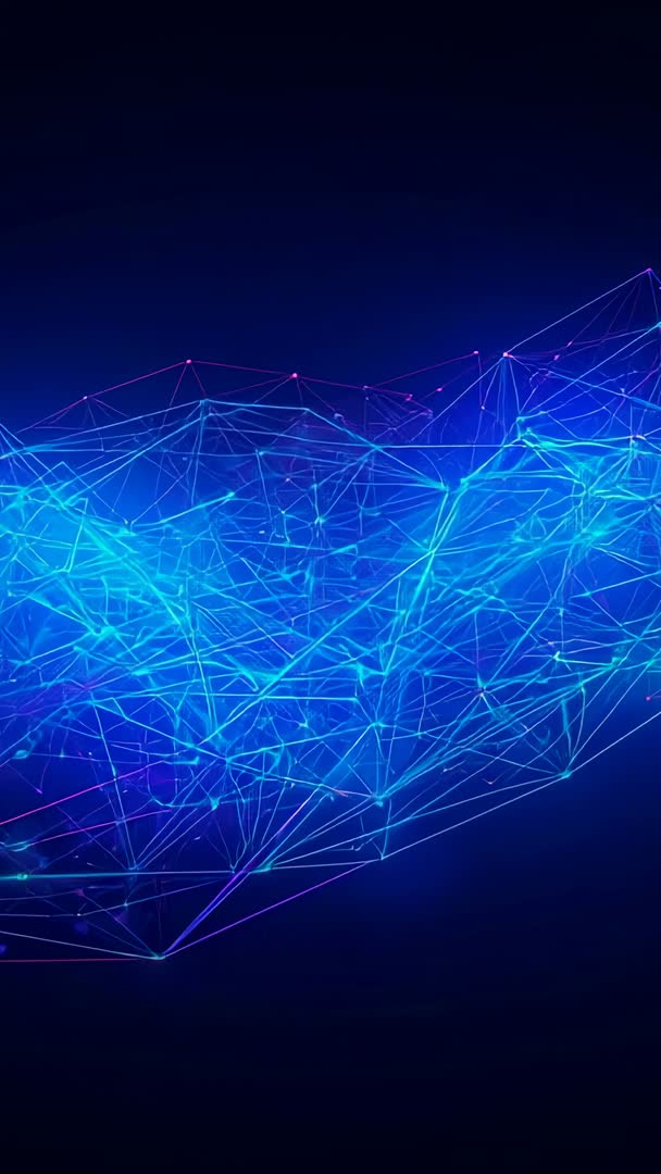AI Generated Video. Vertical video featuring pulsing 3D mesh mapping dynamic data flow with glowing nodes and connecting lines. Neon blue and purple palette creating holographic high-tech atmosphere and strong visual depth. Use for tech presentations, app intros, website hero banners, social media vertical ads, conference openers, UI demo backdrops, and music visualizers. Loopable motion working well for background video in product demos, cybersecurity storytelling, AI and machine learning narratives, and blockchain visualizations. Provide color grading and speed adjustment options to match brand tone; leave upper frame negative space for overlay text and logo placement.