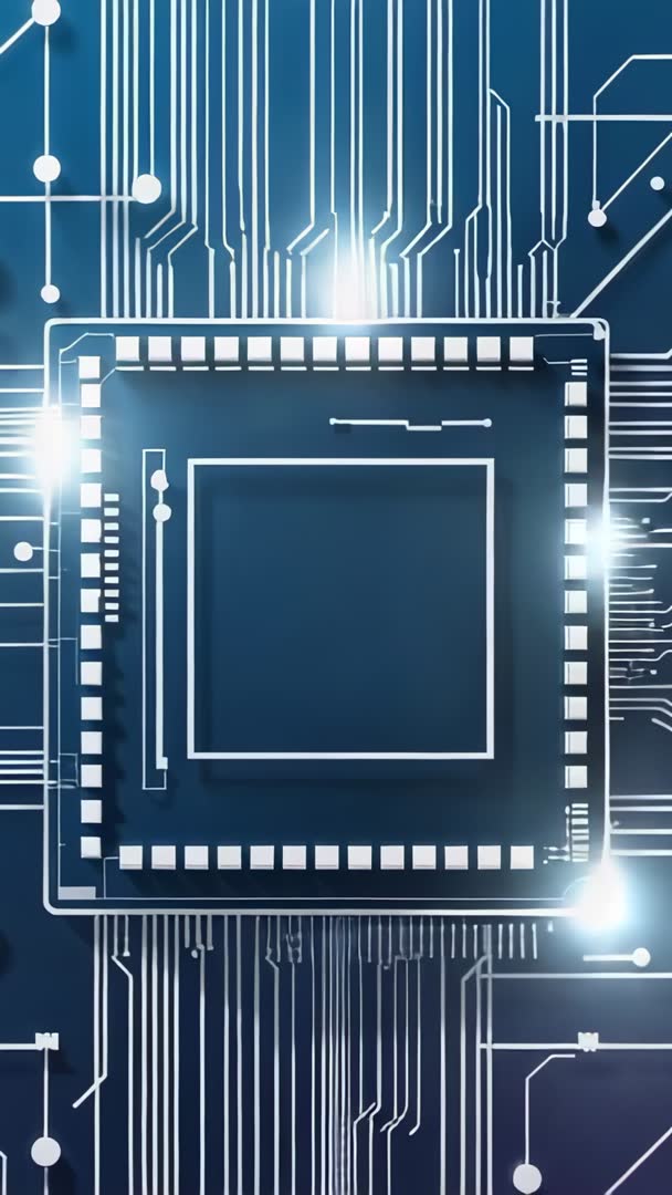 AI Generated Image. Showing vertical close-up of microchip receiving pulse and igniting nodes, synchronizing high-speed data flow along circuit traces. Featuring glowing connection points, layered PCB lines, and central processor outline for modern tech aesthetic. Providing dynamic backdrop for technology company intros, product demos, cybersecurity presentations, semiconductor and electronics marketing, AI and data center explainers. Working well as hero video for websites, social media vertical ads, mobile app promos, and conference loop screens. Including space for title overlays, lower third graphics, and animated infographics, matching dark blue palette and bright white highlights for strong visual contrast.