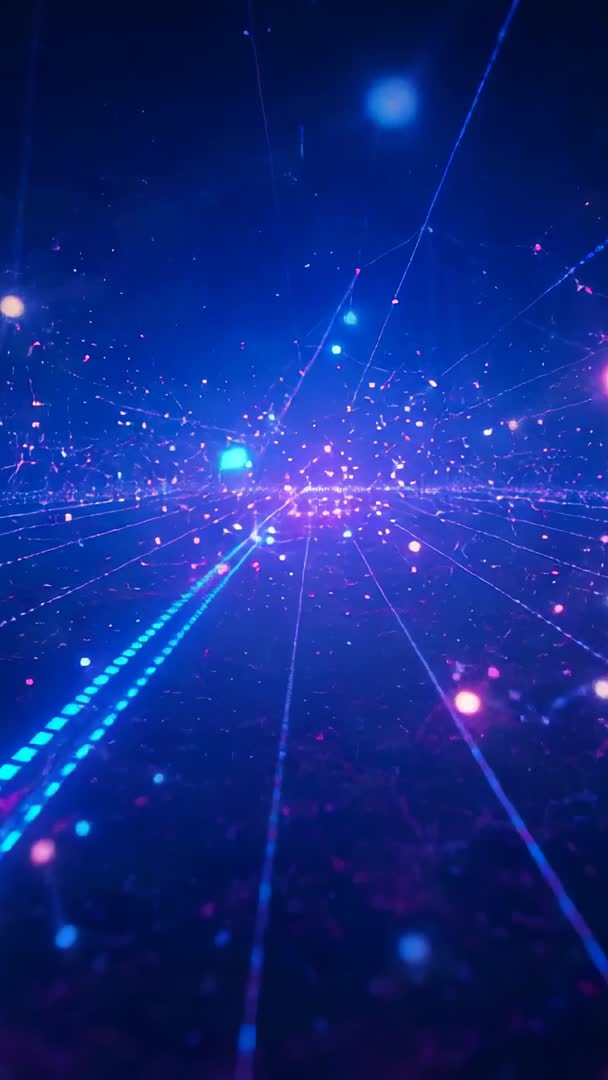 AI Generated Image. Vertical video showing camera moving forward along dotted neon path through grid of glowing nodes and floating particles toward bright digital core. Color palette featuring deep blue, magenta, purple with vibrant neon highlights creating immersive, high-energy atmosphere. Visual composition emphasizing depth, perspective lines, and dynamic particle motion for strong sense of speed and connectivity. Ideal for tech startup intros, app promos, AI presentations, blockchain explainers, music visuals, event LED backdrops, social media vertical ads, smartphone wallpapers. Editing suggestions: loop clip for continuous background, time remap for slow-motion reveal, add logo reveal synced to core burst, layer text overlays and lower-thirds with semi-transparent bars, align electronic soundtrack for tempo-driven hits. Optimized for 9:16 vertical formats and modern digital campaigns.