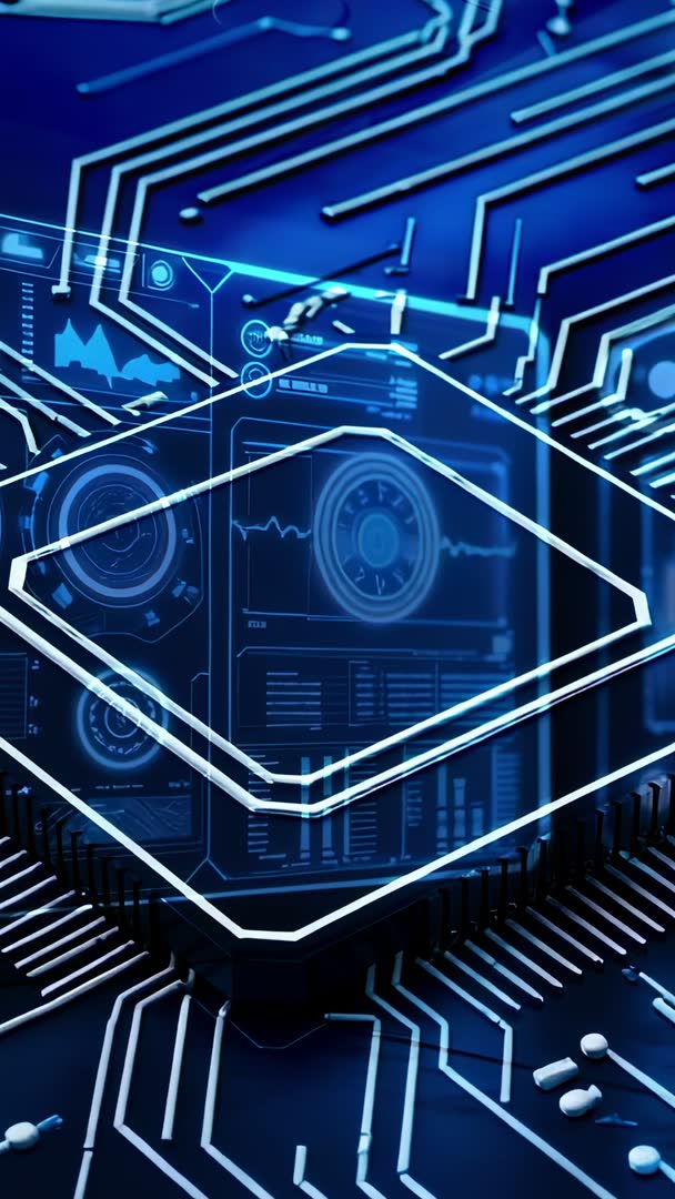 AI Generated Image. Vertical 9:16 video showing microchip pulsing with power signal on circuit board while holographic interface is overlaying with rotating dials, waveform graphs, numeric readouts, and system diagnostics. Featuring deep blue palette with neon highlights, high-tech HUD elements, and active circuit traces conveying energy flow and data processing. Ideal for use in mobile app intros, social media stories and reels, product demo videos, technology pitch decks, cybersecurity campaigns, IoT and electronics presentations, corporate website hero sections, trade show screens, and background loops for streaming. Serving well as visual metaphor for processing power, system monitoring, real-time analytics, and futuristic innovation. Editable for branding, color grading, and text overlay to match campaign needs.