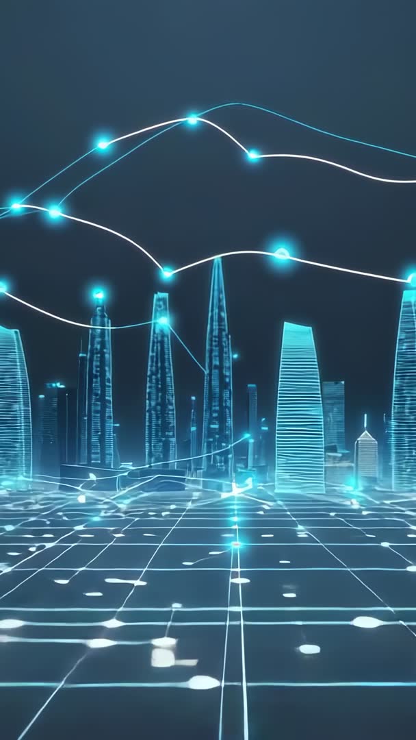 - Vertical tech video of neon city network connecting skyscrapers with pulsing data arcs