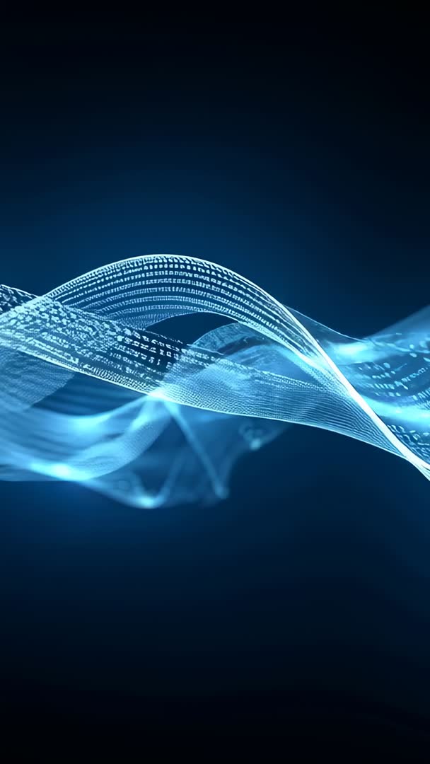 AI Generated Video. Video showing glowing blue ribbon of binary data undulating from left toward right across deep navy digital space. Translucent layered mesh and streaming numeric patterns creating sense of depth, motion, and energy while neon gradient edges highlighting sleek curvature. Composition optimized for vertical mobile aspect ratio, providing dramatic negative space for overlaid text, logos, or UI elements. Serving technology presentations, app intros, mobile ads, social media stories, vertical hero banners, onboarding screens, fintech and cybersecurity promos, broadcast lower thirds, website headers, conference openers. Loopable animation allowing seamless background playback, customizable for color grading, speed adjustments, and graphic overlays to match brand style.