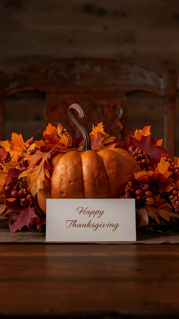 AI Generated Video. Vertical clip showing pumpkin centerpiece nestled in vibrant autumn leaves and berry garland on rustic wood table. Camera holding and framing for intimate close-up, capturing warm textures, rich orange and brown tones, and elegant handwritten 'Happy Thanksgiving' card front and center. Ideal for social media stories and reels, holiday greeting video, restaurant or catering promotion, seasonal product showcase, blog hero banner, and e-card background. Use for branding campaigns, event invitations, in-store displays, or hospitality marketing to evoke cozy, inviting mood. Suggested treatments: apply gentle slow pan or subtle rack focus, add soft ambient music, overlay seasonal greeting text, and color grade for warmer tones to enhance fall atmosphere.