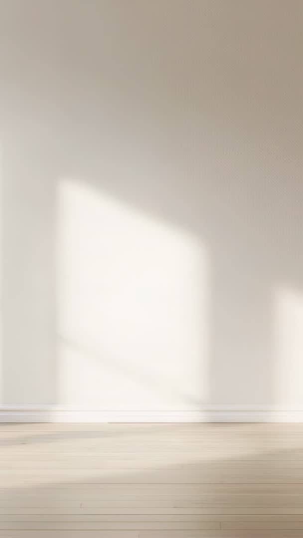 AI Generated Image. Vertical time-lapse capturing daylight patch moving across pale wall and light wood floor near baseboard. Soft shadow edges creating minimalist abstract composition and warm morning light producing calm mood. Suitable for background use in social media vertical videos, phone wallpapers, product mockups, calming intros, meditation apps, architectural visualization, home decor presentations, real estate listings, and marketing overlays. Loopable footage allowing seamless repeats; neutral color palette allowing easy color grading and text or logo overlay on upper wall area. Editing suggestions: apply slow motion or time remapping for tranquil effect, crop to 9:16 for Reels and Stories, add ambient audio or soft piano for atmosphere, use subtle vignette for focus. Ideal for designers and creators needing clean, serene interior motion for promotional content, mood sequences, or minimalist visual storytelling.