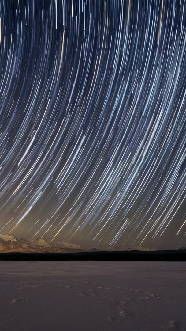 - Vertical time-lapse showing star trails sweeping over frozen lake and mountain ridge