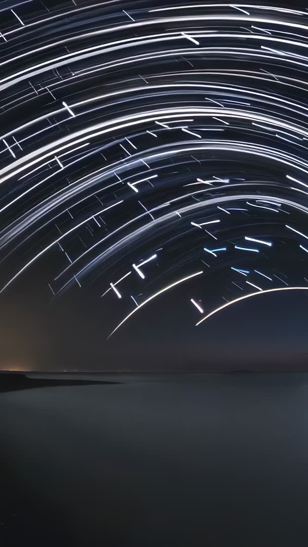 AI Generated Image. Vertical time-lapse clip showing star trails arcing across night sky above calm coastal water and silhouetted shoreline. Long exposure streaks tracing circular paths, creating hypnotic motion against deep blue sky. Gentle water surface reflecting faint sky glow, adding serene foreground depth. Use for mobile background, social media reels, travel and tourism promos, cinematic intros, meditation and relaxation apps, astronomy tutorials, and website hero banners. Ideal for looping backgrounds, ambient music videos, environmental storytelling, and product showcases requiring tranquil nocturnal atmosphere. Technical notes: vertical orientation, long exposure time-lapse, high contrast star streaks, minimal light pollution. Color palette leaning toward deep blues, cool whites, occasional pale amber near horizon.