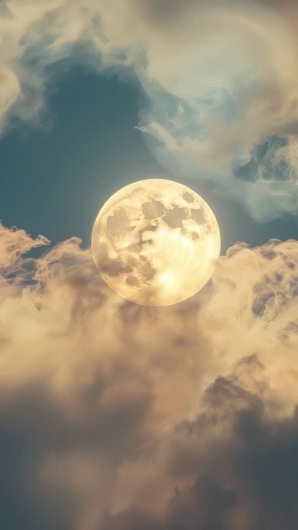 AI Generated Image. Vertical timelapse showing full moon drifting through swelling golden clouds against deep teal night sky, periodically obscuring and revealing lunar surface. Visual mood evoking calm, mystery, wonder, and gentle motion with warm highlights and cool teal contrast. Ideal for mobile wallpaper, social media vertical stories, Instagram Reels, TikTok backgrounds, ambient music visuals, meditation and sleep apps, astrology or astronomy content, title screen for short films, and seasonal campaigns. Clip working well as loopable background or slow cinematic opener. Postproduction tips: extend loop with subtle crossfade, add soft ambient soundtrack or slow piano, apply mild color grade to enhance teal and gold tones, place text or logo in upper third or lower third clear areas to avoid moon overlay.