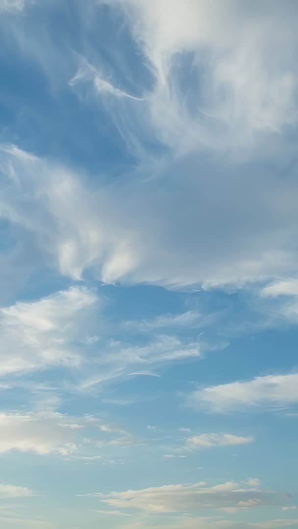 AI Generated Image. Video showing delicate cirrus and altocumulus wisps shifting and merging across wide open blue sky. Vertical framing emphasizing tall negative space and soft cloud textures while wind-driven motion creates gentle, slow-moving patterns and subtle light shifts. Suitable for background loops, mindfulness and meditation apps, social media reels and vertical stories, broadcast lower thirds, website hero headers, and relaxation playlists. Useful as B-roll for weather segments, nature documentaries, environmental campaigns, and time-lapse compilations. Easy to color grade for sunrise or sunset mood and to loop seamlessly for long-form ambient video.