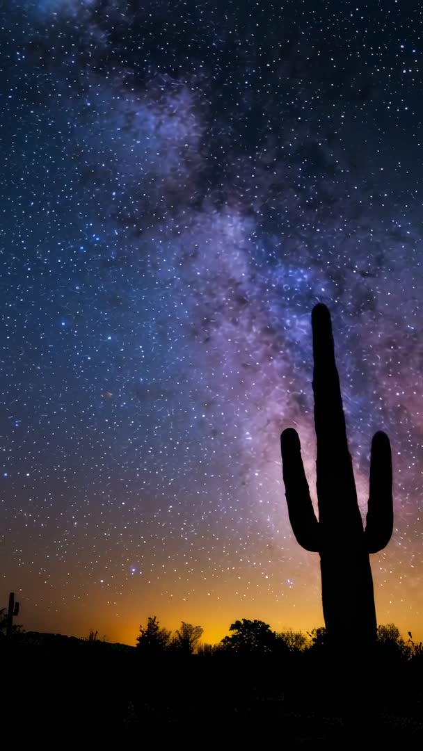 - Vertical Timelapse Showing Milky Way Arcing Over Saguaro Cactus Silhouette Against Desert Horizon