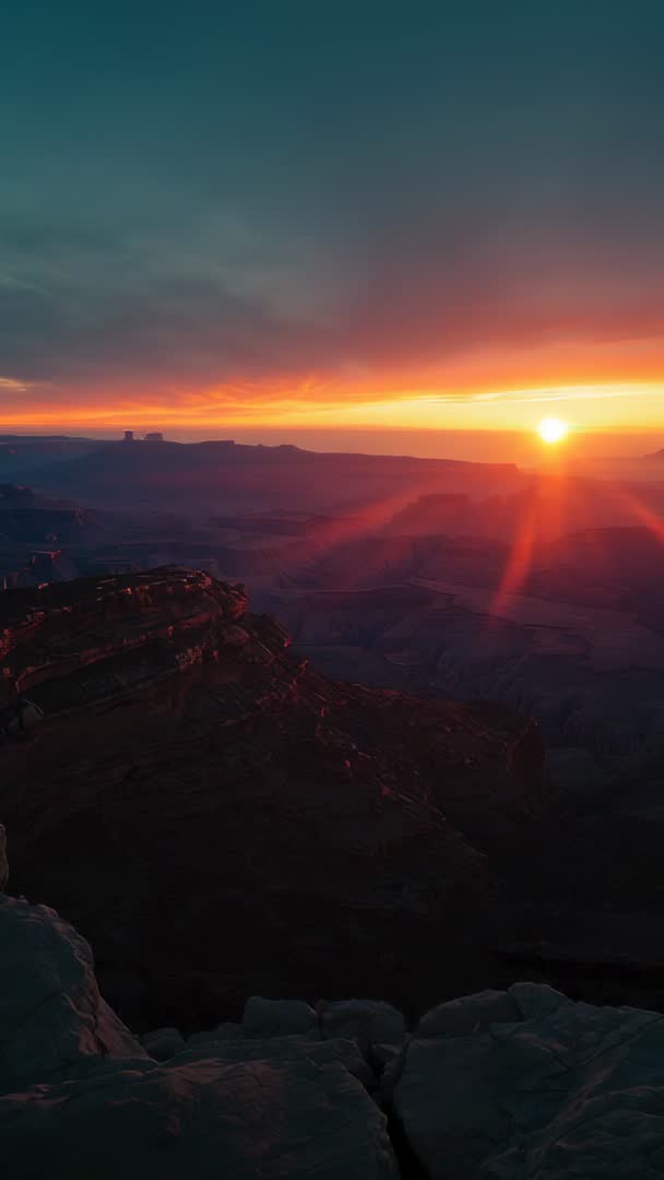 AI Generated Video. Capturing sun moving behind mesas while warm light paints layered canyon walls and clouds. Vertical timelapse emphasizing deep silhouettes, long sun rays, and expansive horizon with wide copy space in upper frame. Foreground rock ledge providing strong foreground interest and sense of scale. Working well for travel promos, adventure intros, nature documentaries, meditation and relaxation videos, mobile wallpapers, social media reels, and website hero backgrounds. Allowing easy color grading toward warm cinematic tones or cool moody palette for dramatic contrast. Suggesting loop lengths between 6 and 20 seconds and overlaying text in upper third to preserve landscape detail.