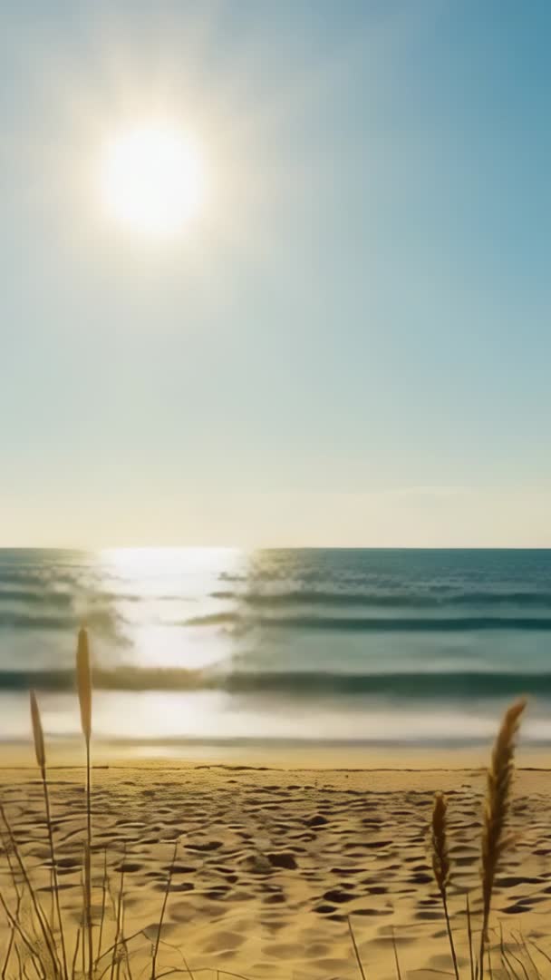 AI Generated Image. Timelapse showing sun descending toward horizon over calm ocean while waves gently roll onto sandy beach and dune grass sways in foreground. Warm golden-hour light reflecting on water and creating soft highlights across surface. Minimalist composition offering wide sky area and soothing vertical motion, evoking peaceful, meditative mood. Ideal for smartphone backgrounds, social media stories and reels, mindfulness and meditation apps, relaxation videos, travel promos, hotel lobby screens, website hero banners, digital signage and screensavers. Use as loopable background for guided breathing sessions, yoga classes, spa marketing or ambient visuals during events. Color grading friendly and easy to crop for different vertical formats.