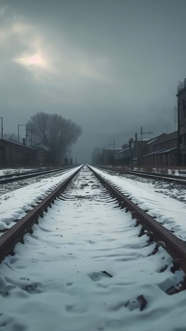 AI Generated Video. Tracking forward along snow-covered rails through dense fog in industrial rail yard. Evoking cold, moody atmosphere with strong leading lines drawing eye to horizon. Featuring overcast sky, low visibility, industrial buildings flanking tracks, and light snow covering ties. Serving as film establishing shot, music video intro, atmospheric commercial, social vertical ad, weather segment, transportation or logistics content, and documentary sequence about industry and abandonment. Providing background for title cards, lower-thirds, app splash screens, and social stories. Working well with slow motion, subtle color grade, and loop edits to extend duration. Delivering cinematic, lonely mood for editorial, marketing, and creative projects.