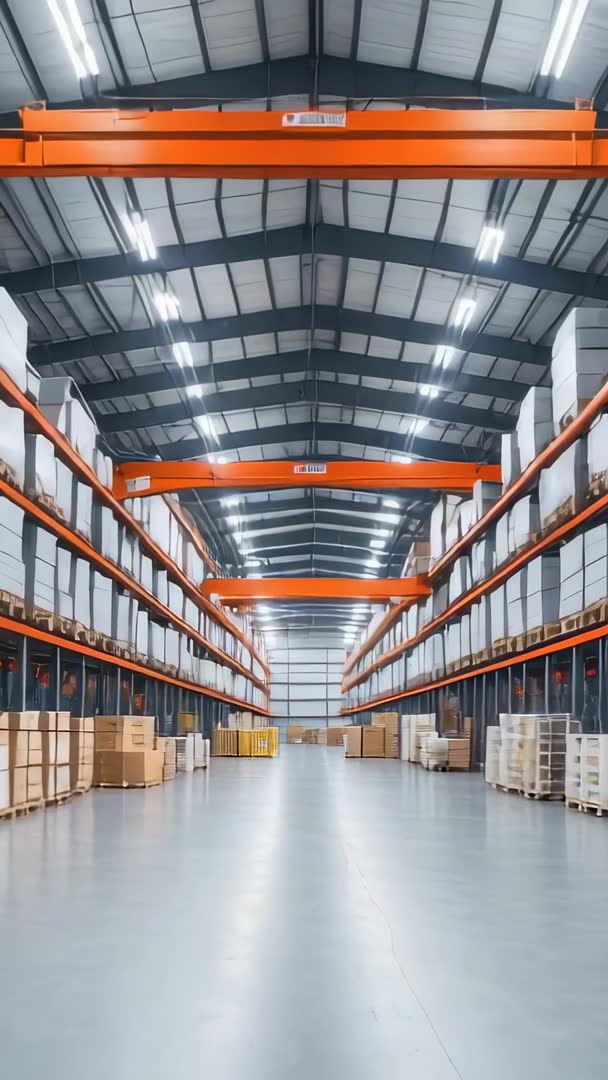 AI Generated Image. Camera tracking forward down central warehouse aisle, revealing high metal racks, stacked pallets, orange overhead cranes. Bright industrial lighting reflecting on polished concrete floor, strong leading lines creating dramatic depth and perspective. Footage suitable for corporate logistics videos, supply chain presentations, ecommerce fulfillment promos, industrial safety training, website hero banners. Editors using footage for transitions, timelapse overlays, slow push-in sequences. Color grading simple for brand palette matching; safe area for lower-thirds and captions at top and bottom. Vertical orientation optimized for mobile, social, and reel platforms. Ideal for illustrating inventory management, warehouse automation, facility architecture, or logistics operations.