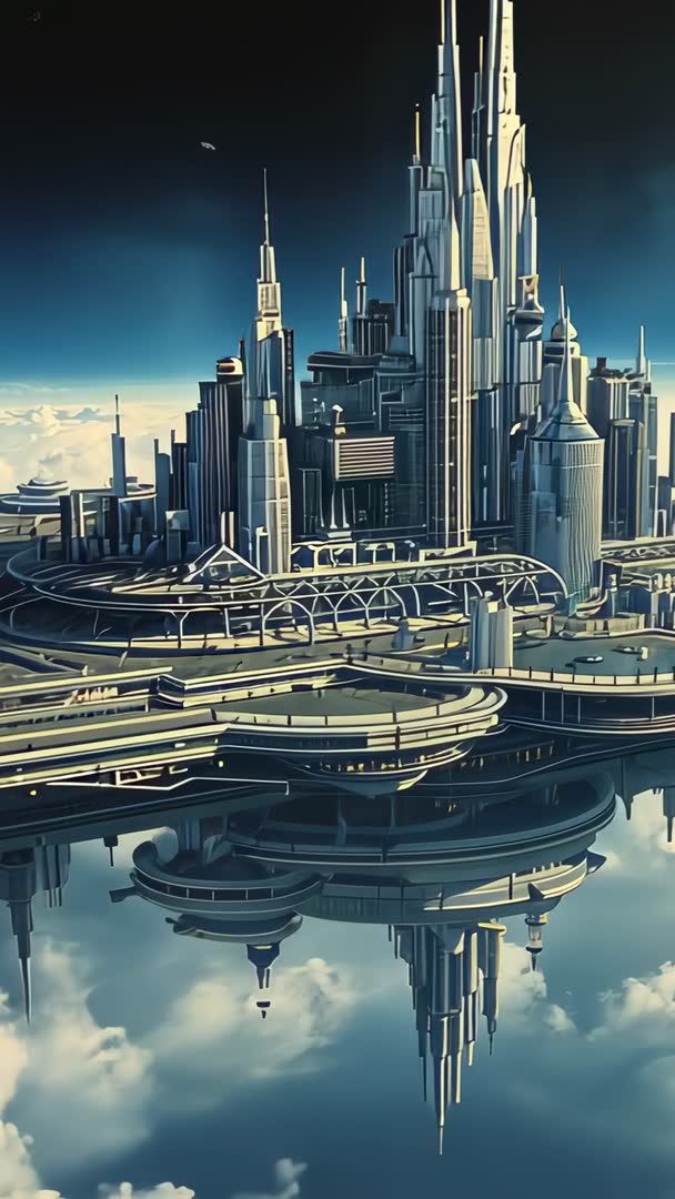 AI Generated Video. Video showing slow upward tracking shot over futuristic sky city, revealing towering spires, mirrored reflection on cloud layer, and elevated monorail weaving through multi-level platforms. Camera movement creating cinematic reveal suitable for title sequence, opener, or background for technology and transport promos. Visual mood blending sleek metallic architecture, soft cloud light, and high-contrast skyline for dramatic futuristic atmosphere. Usage ideas include mobile story and reel backgrounds, sci-fi short or film intro, hero header for tech startup or transport concept, AR/VR demo, and architectural visualization. File optimized for vertical social formats and mobile playback, offering loopable segments and clear focal points for text overlays and motion graphics.